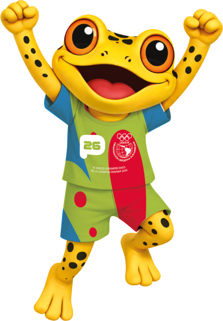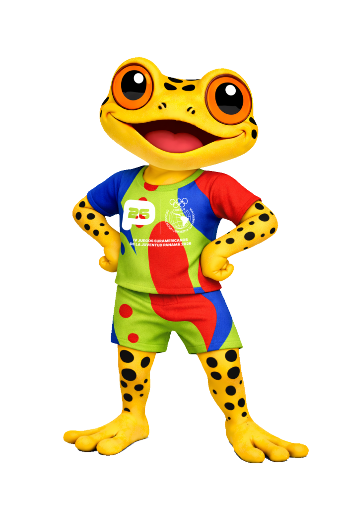 Antón representa la rana dorada de Panamá, un símbolo de la biodiversidad del país y del espíritu alegre de los Juegos Suramericanos de la Juventud.